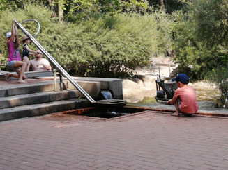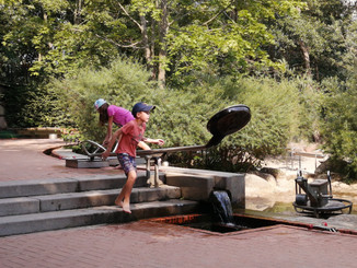 Zuletzt sind wir zum Wasserspielplatz gegangen. Ein sehr großes Areal mit Wasserrinnen, Peltonrädern, Stauklappen, einem Wasservorhang und vielem mehr.