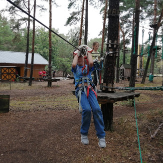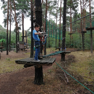 Gleich in der Früh fuhren wir zum Kletterwald in Lübben. Leider setzte gerade jetzt der erste Regen der Saison ein. Dort angekommen hatte der Herr am Empfang bereits das Regenradar offen und vertröstete uns auf 13:00 - 14:00, denn dann wird der Regen vorübergezogen sein. Wir vertrieben uns die Zeit im Auto mit Ansichtskarten schreiben und gingen dann noch Mittagessen im Gasthaus Lehniksberg.