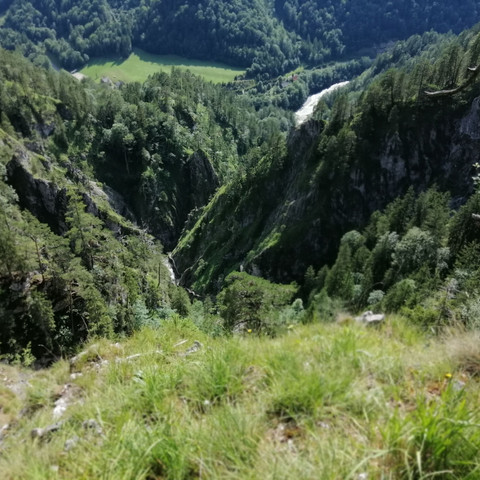 Zurück gab es die Möglichkeit, den gleichen Weg zu gehen oder jenen über den Waldabstieg "Jägerriedl". Unsere Neugier war groß, wir wussten auch nicht genau, wo wir wieder im Tal ankämen, also gingen wir abenteuerlustig einfach den Abstieg "Jägerriedel". Der ist aber tatsächlich herausfordernd, weil er steil und teilweise rutschig ist. Das hat aber die Kinder nicht davon abgehalten, ja eher angespornt, sich gegenseitig zu erzählen, was wohl bei einem Absturz passieren würde. Die Ideen reichten vom Umfallen der Gruppe wie Dominosteine bis zum Absturz mit Landung am Baumwipfel, der einen wieder zurückschleudert.